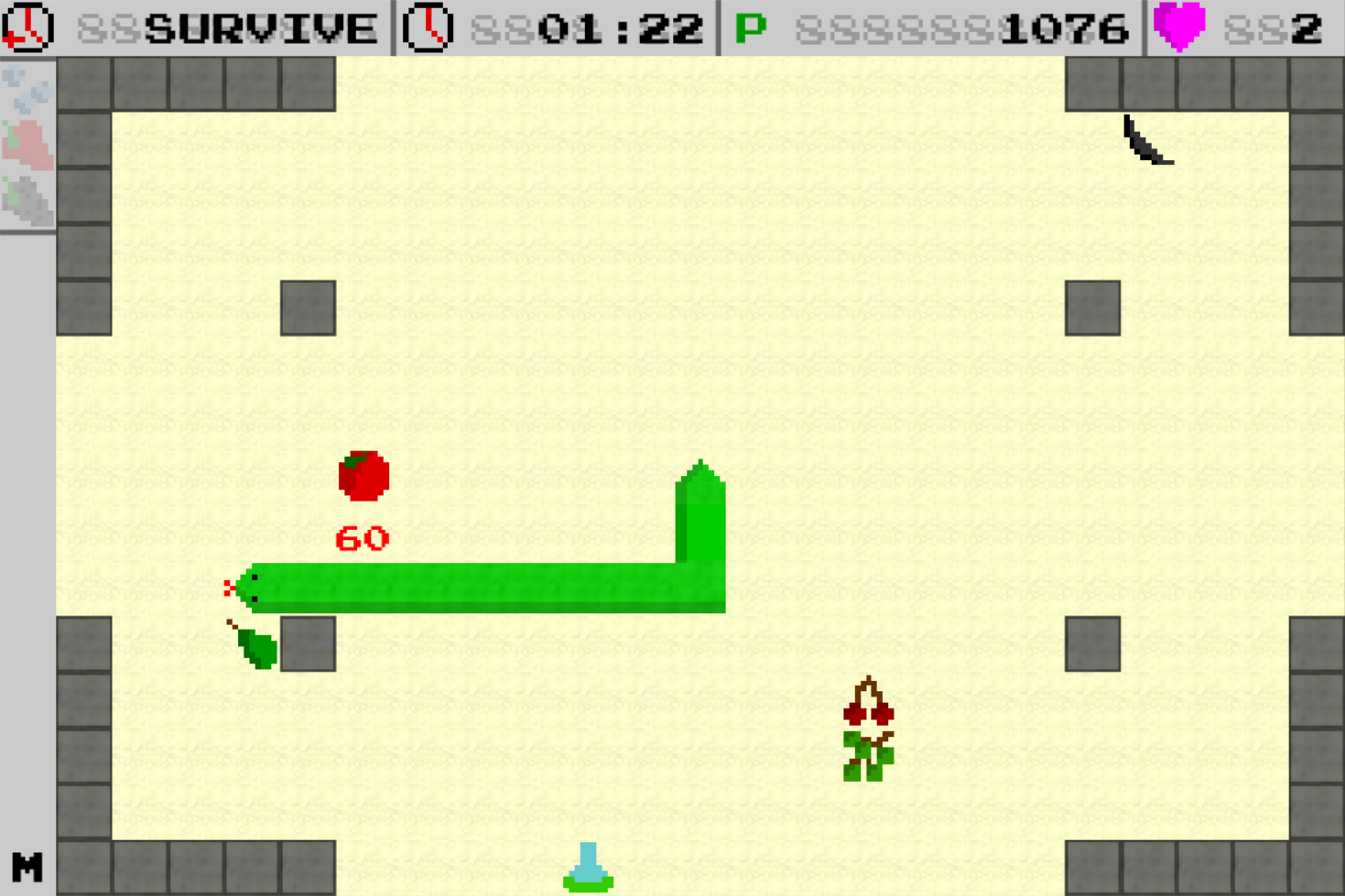 As with the original you have to eat fruit, which makes your snake longer, and it then becomes harder to move around the level. However, in Fruity Snake different fruit and bonuses have different effects. Some will make your snake longer by one square, some two, some four. There are also other bonuses, such as things to make your snake shorter, dynamite to blast through walls and even bugs that make you move erratically.